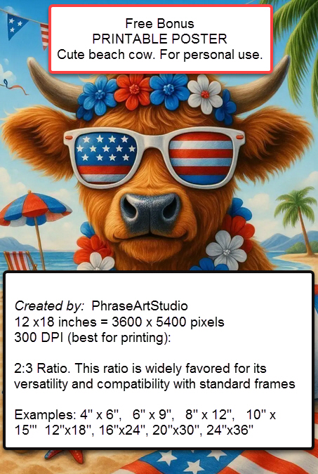 Here’s your FREE bonus printable poster from PhraseArtStudio — featuring our adorable Beach Cow in Stars & Stripes Shades.